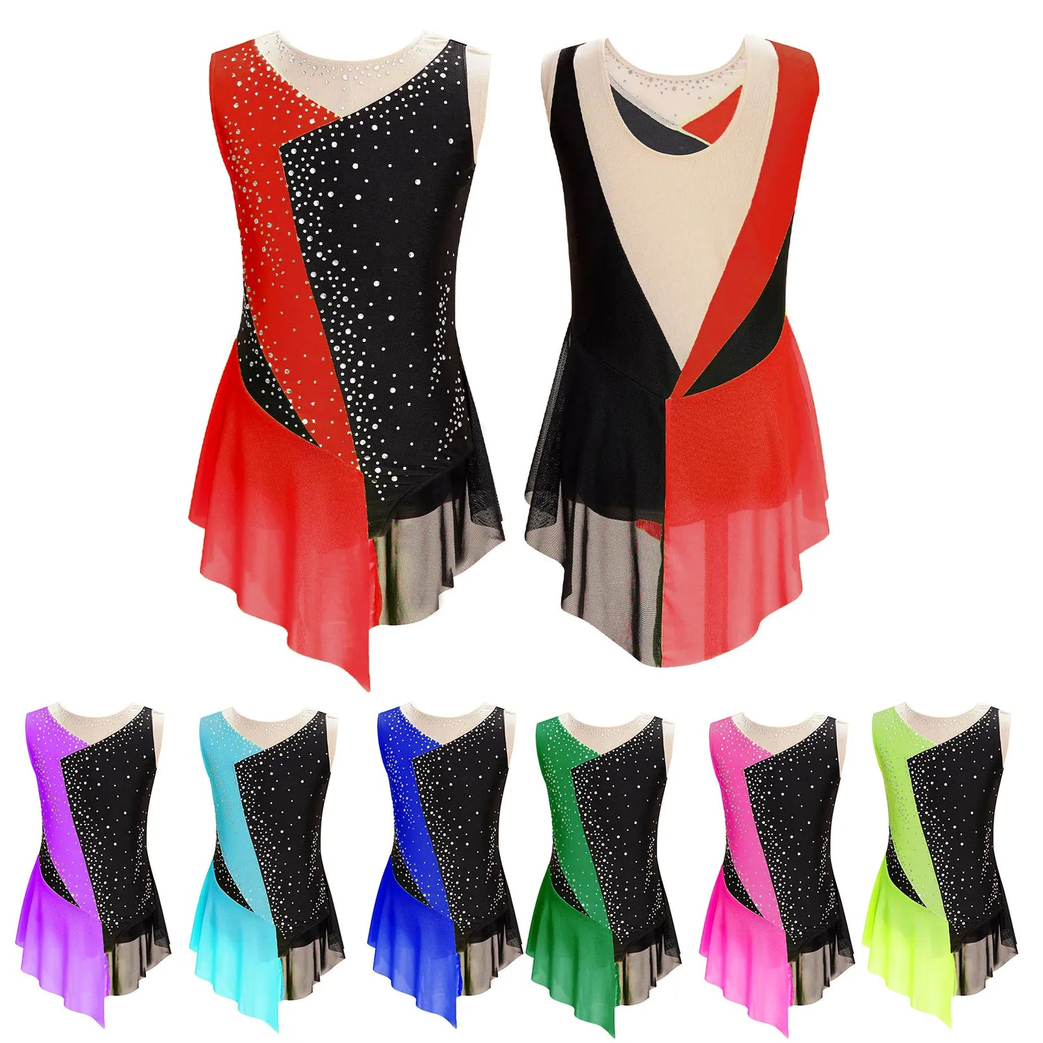 Kids Girls Figure Skating Dress Shiny Rhinestone Sheer