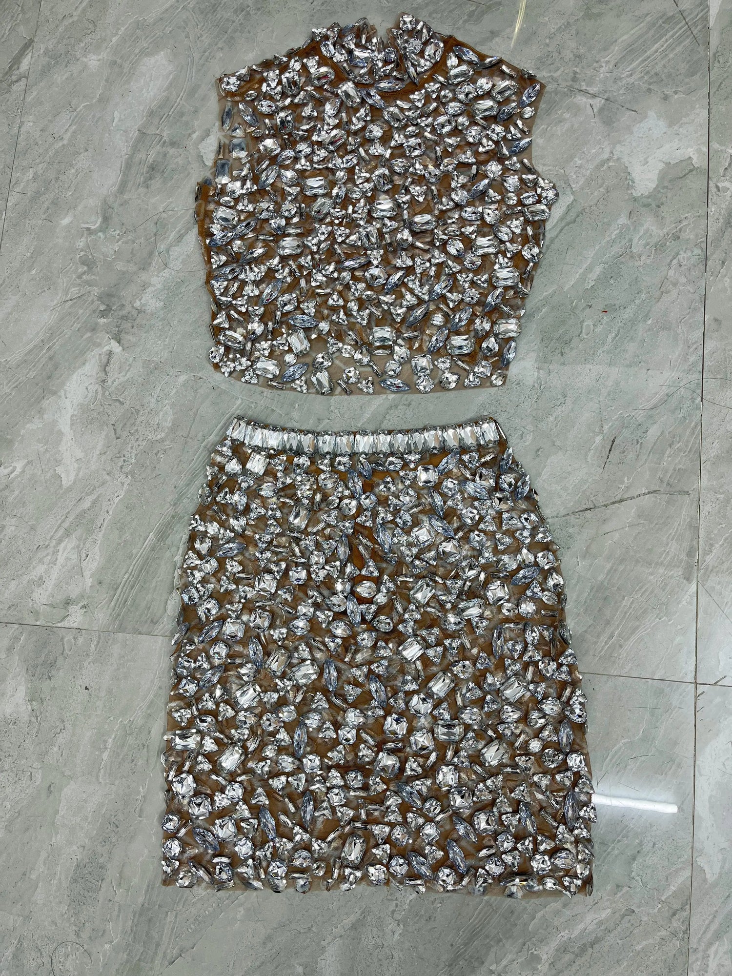 Silver Big Rhinestones Shining Top Skirt Set Sexy