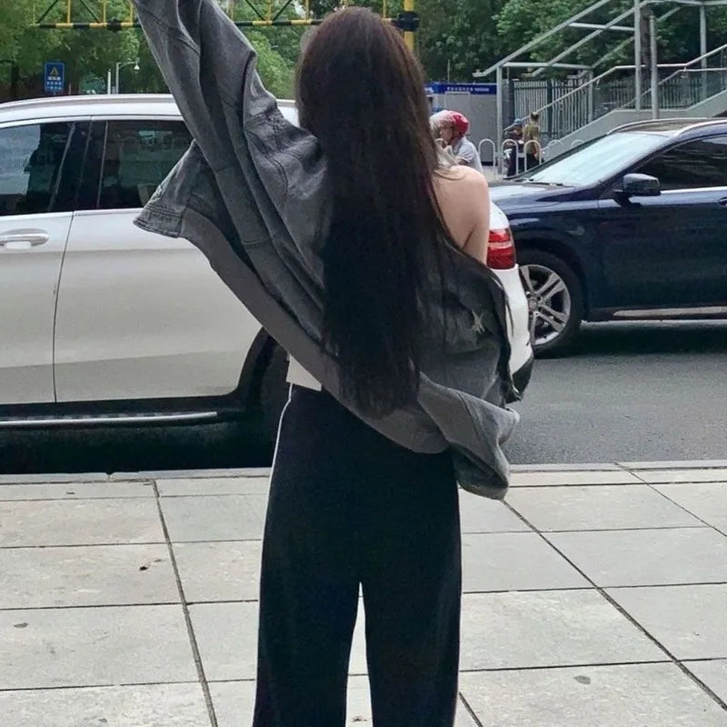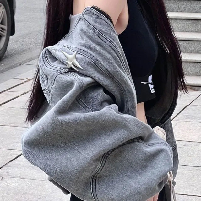 Grey Women Denim Jackets Y2K Cross Crop Hippie