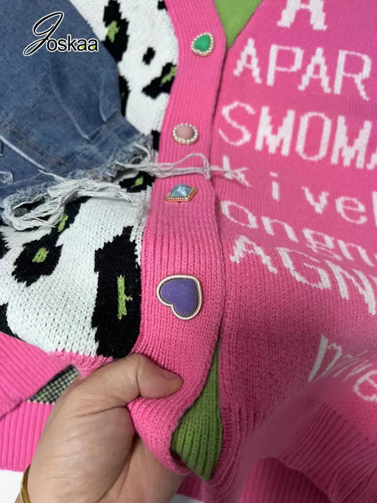 Joskaa Women Knitted Oversized Sweaters Denim Patchwork Leopard - Rose pink / One Size / VIP Price is backordered and will ship as soon as it is back in stock.
