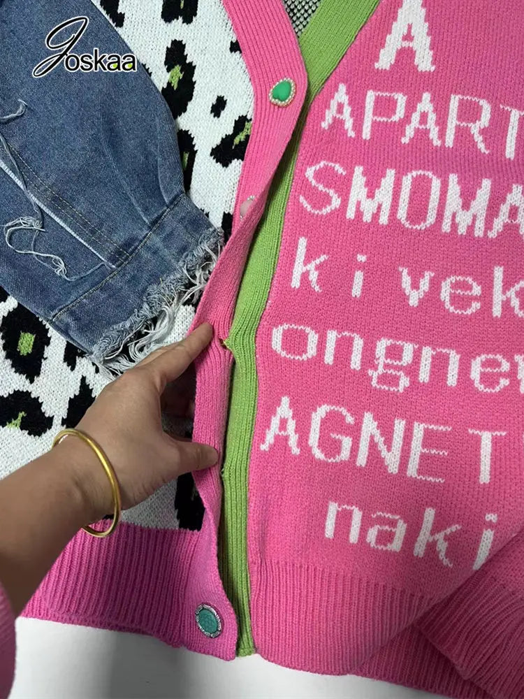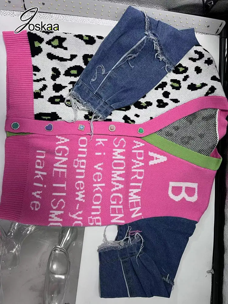 Joskaa Women Knitted Oversized Sweaters Denim Patchwork Leopard