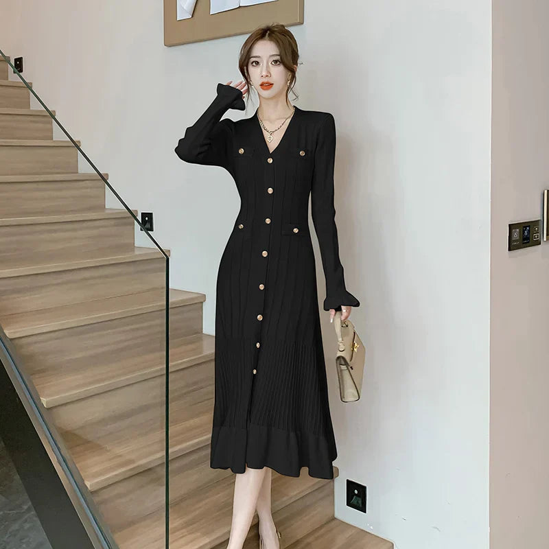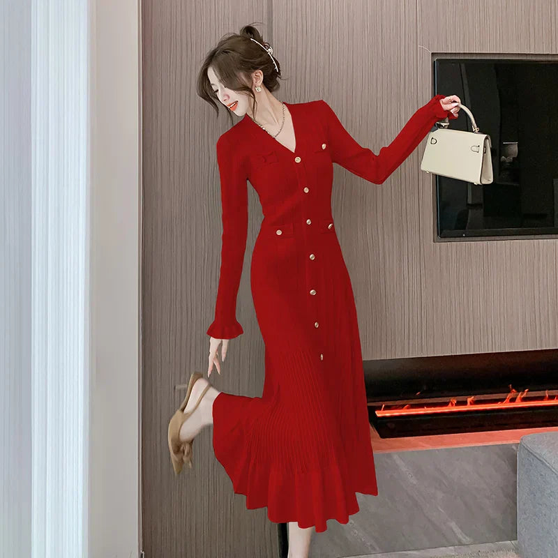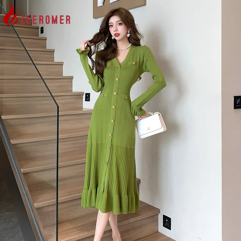 Spring French Fashion Green Knitted Mid Length Dress - Beige / S / VIP Price is backordered and will ship as soon as it is back in stock.