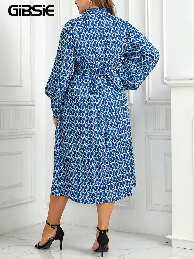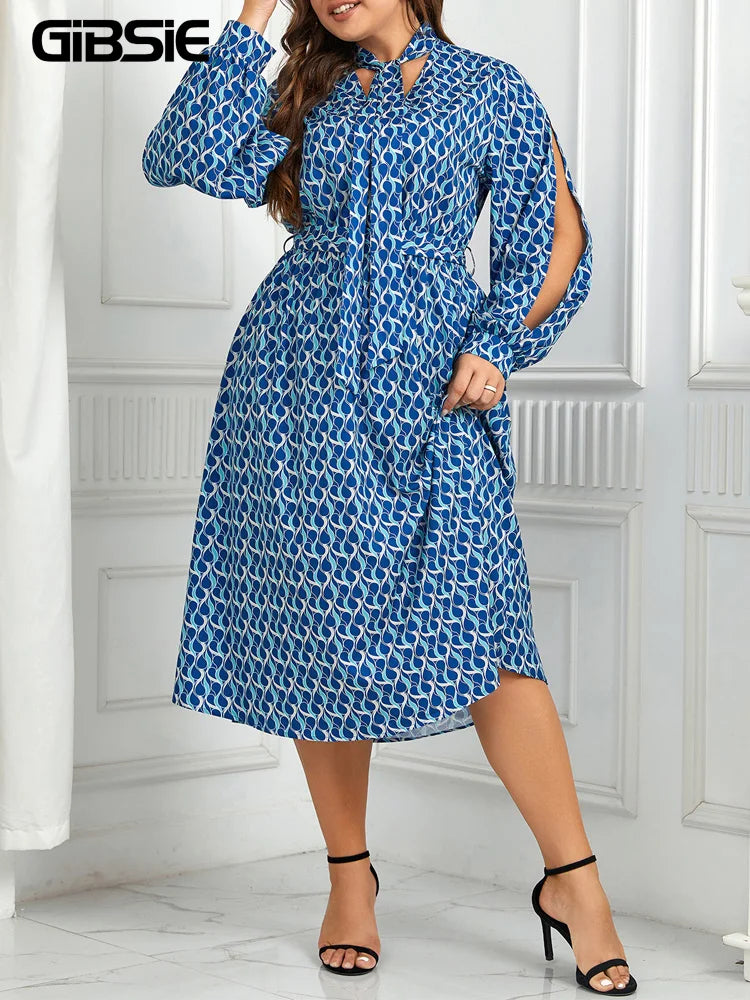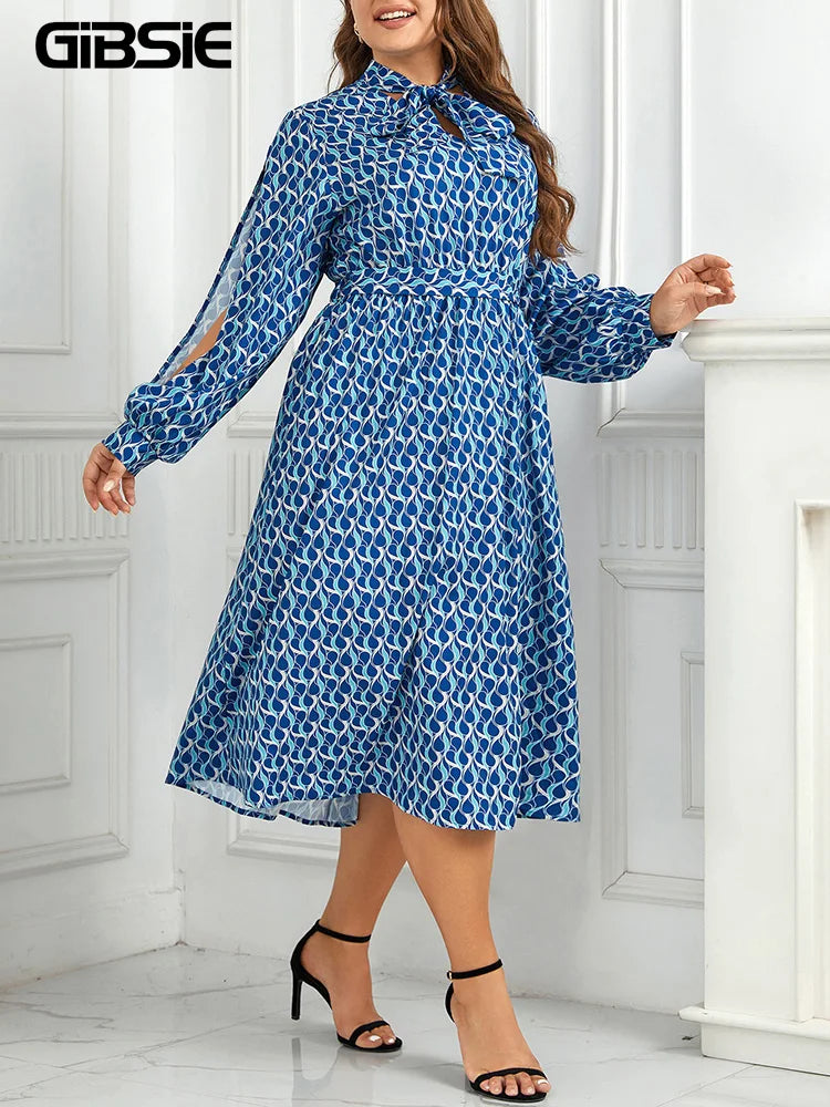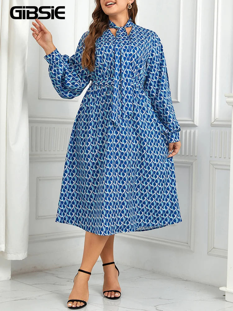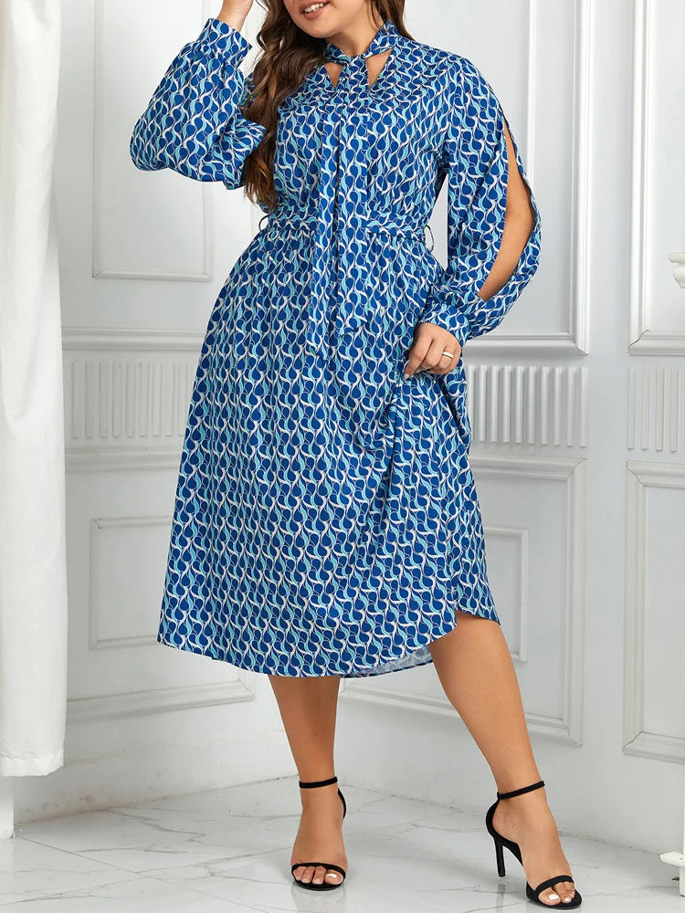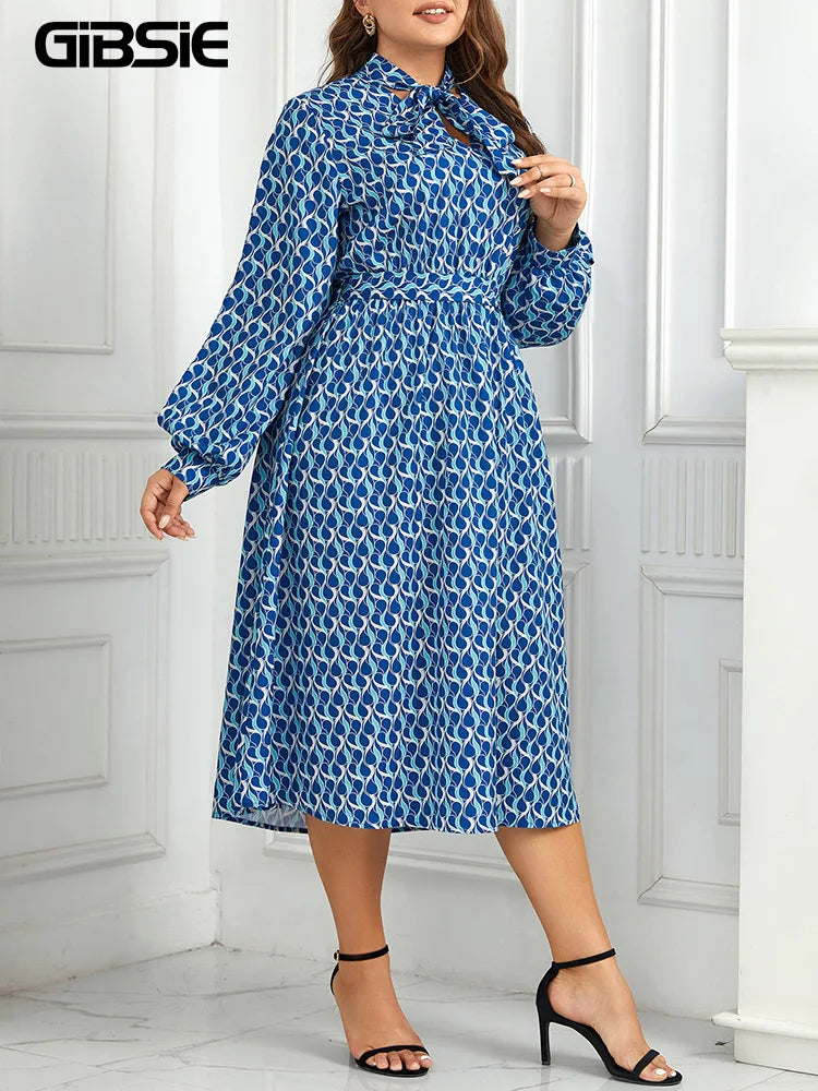 Gibsie Bow Tie Neck Belted Print Long Dress - Blue / XL / VIP Price is backordered and will ship as soon as it is back in stock.