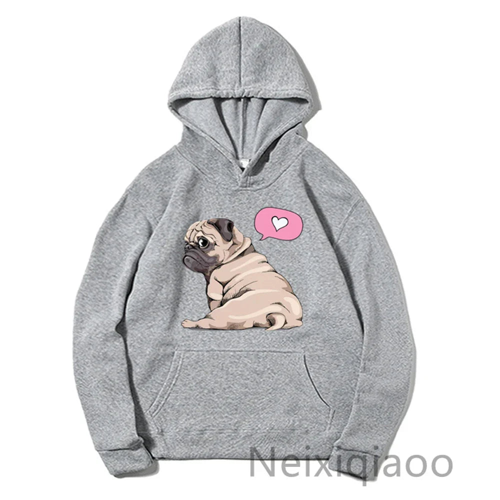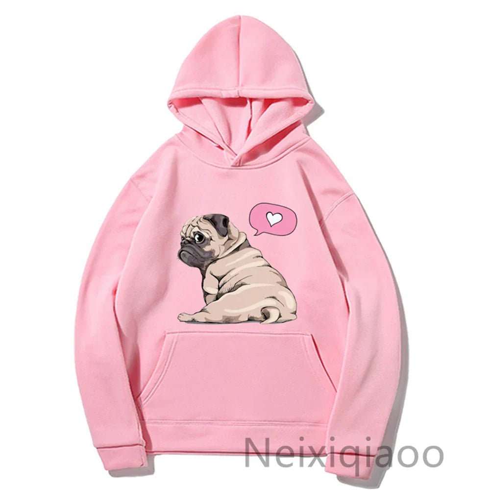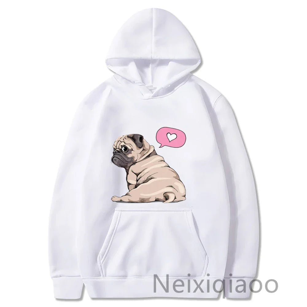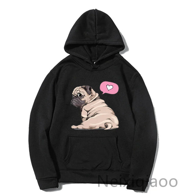 Kawaii Cartoon Pug Dog Print Hooded Sweatshirt Women
