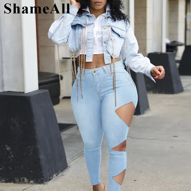 Street Asymmetrical Cut Hole Stretchy Skinny Jeans 3Xl - Light Blue / XL / VIP Price is backordered and will ship as soon as it is back in stock.