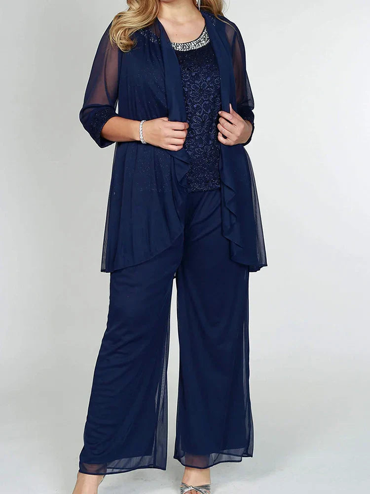 Floral Lace / Sleeve Solid Three Pieces Set - Navy Blue / XXXL / VIP Price is backordered and will ship as soon as it is back in stock.