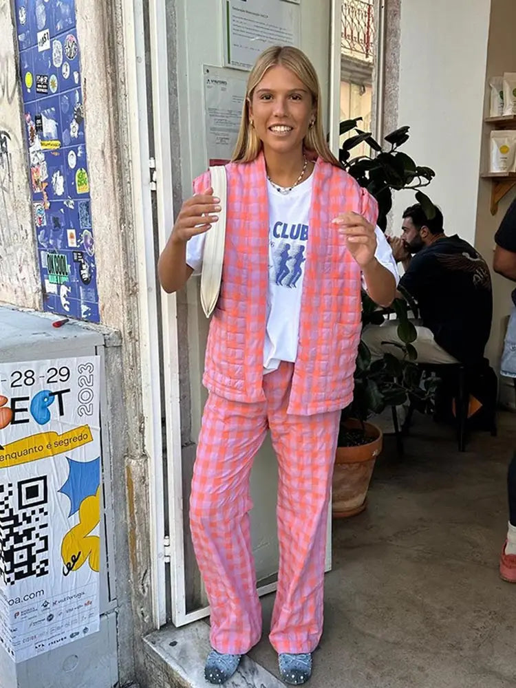 Women Fashion Plaid Pants Piece Sets Loose Sleeveless