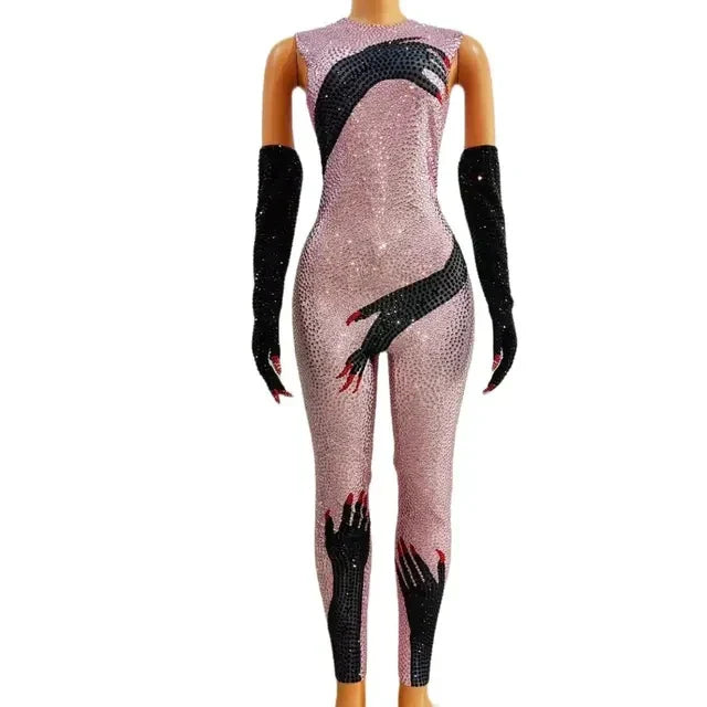 Black Hands Touch Shinny Body Sexy Women Jumpsuit - Pink / XL / VIP Price is backordered and will ship as soon as it is back in stock.