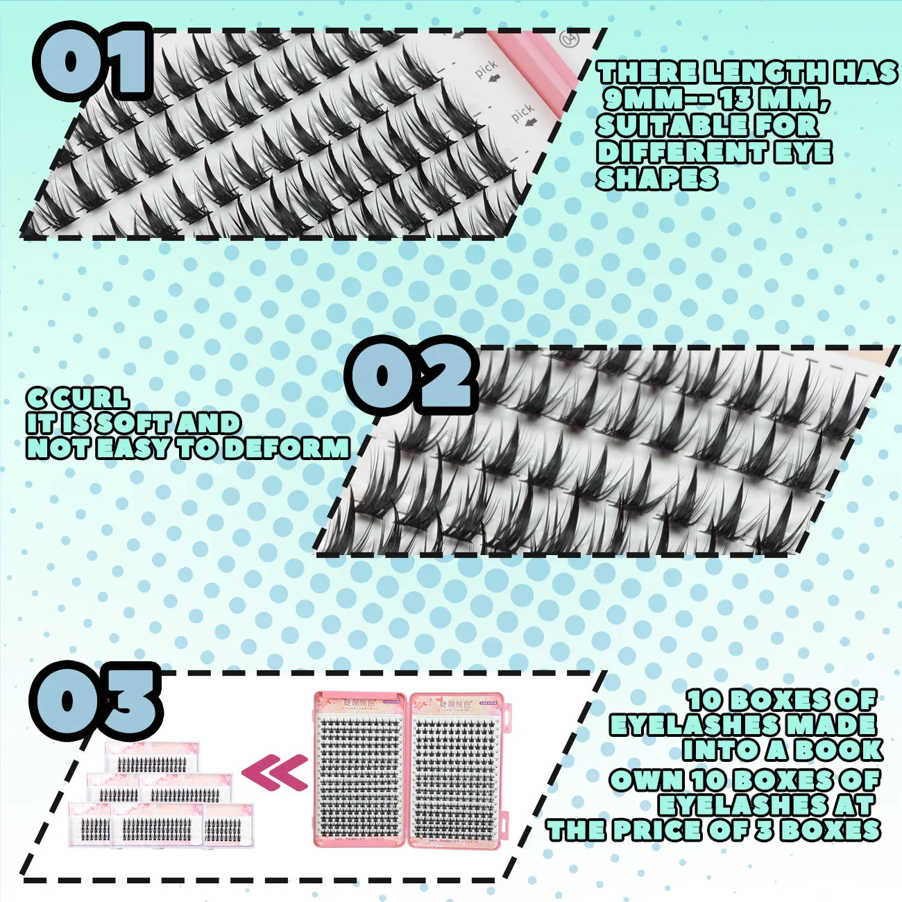 - False Eyelashes Type : Heat Bonded Cluster Lashes