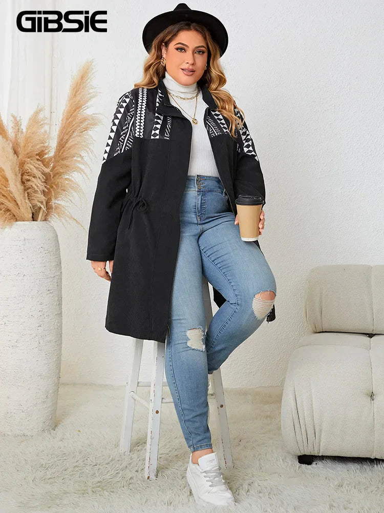 Gibsie Ethnic Print Black Mid Long Coat Women