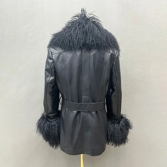 Lady Natural Mongolian Fur Leather Jacket Real Sheepskin