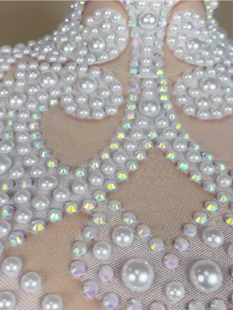 Luxury White Pearls Long Sleeves Women Bodysuit Transparent - Beige / S / VIP Price is backordered and will ship as soon as it is back in stock.