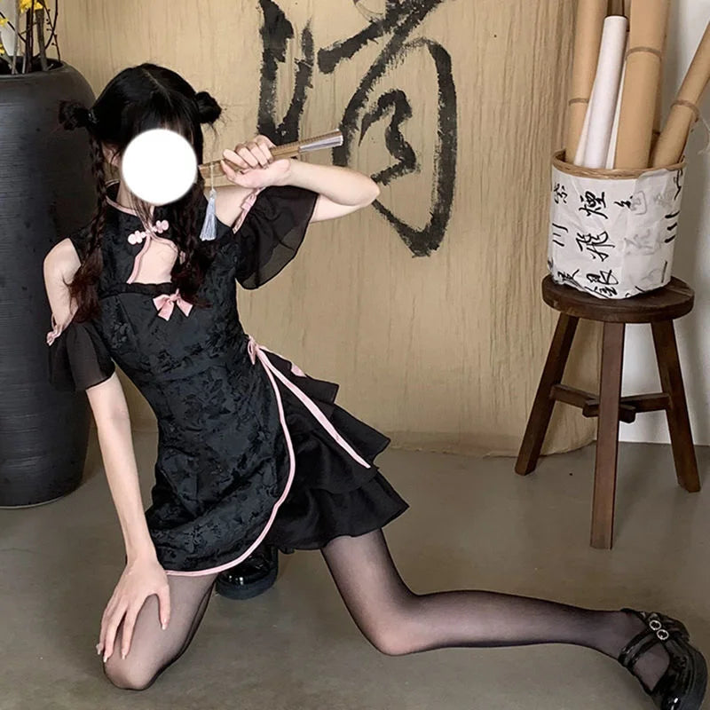Retro Lolita Style Y2K Summer New Improved Cheongsam - black / S / VIP Price is backordered and will ship as soon as it is back in stock.