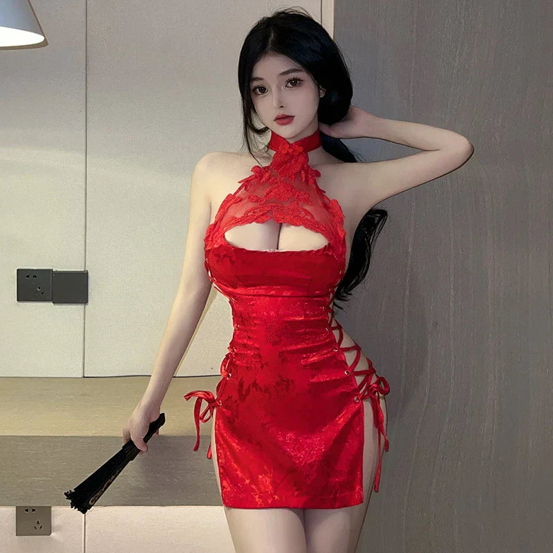 Sexy High Slit Hollow Lace Cheongsam Skirt Set - Red / One Size / VIP Price is backordered and will ship as soon as it is back in stock.