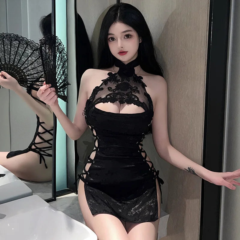 Sexy High Slit Hollow Lace Cheongsam Skirt Set