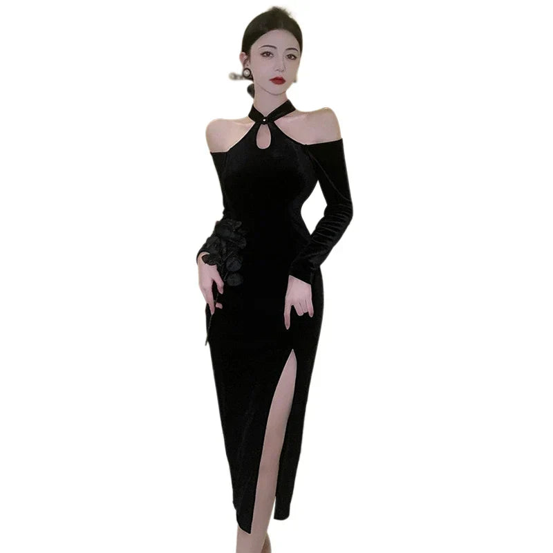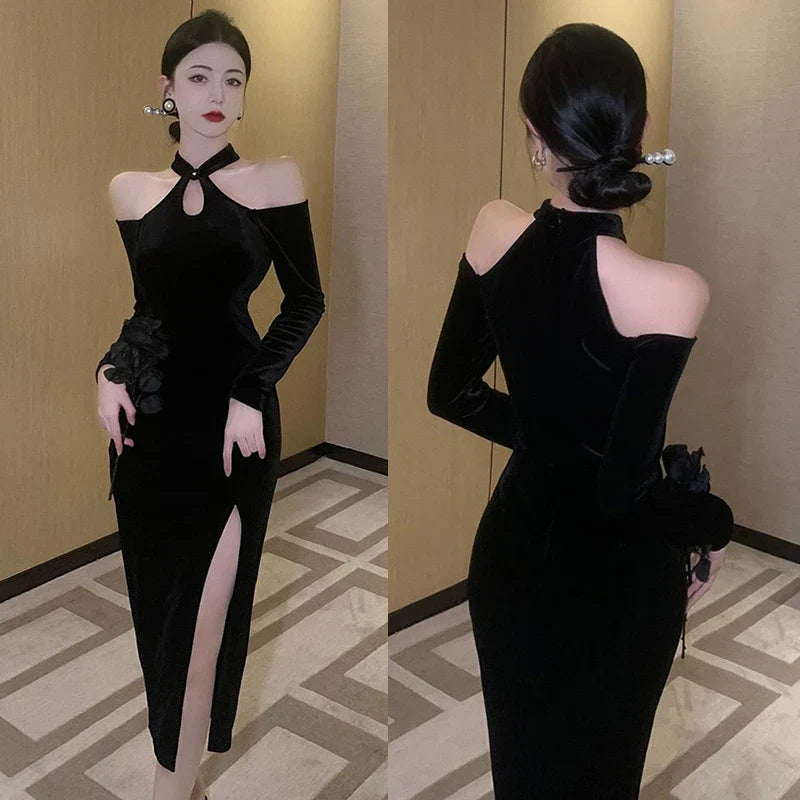 Women' Dress Off Shoulder Slim Sexy Split Cheongsam - black / M / VIP Price is backordered and will ship as soon as it is back in stock.