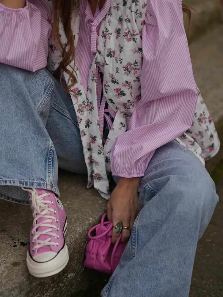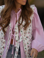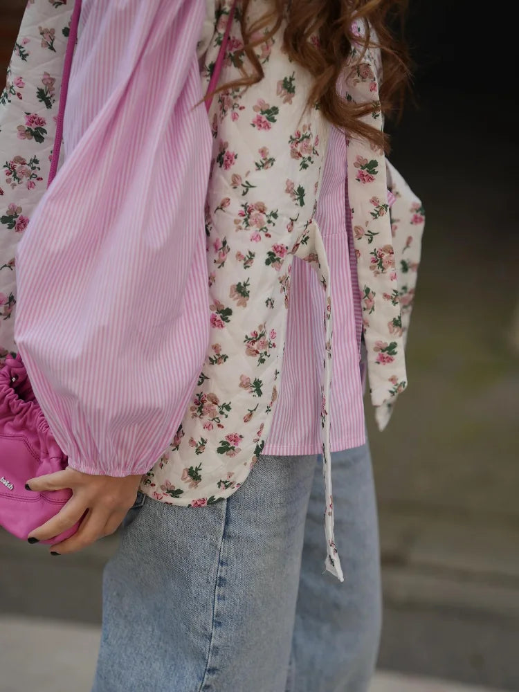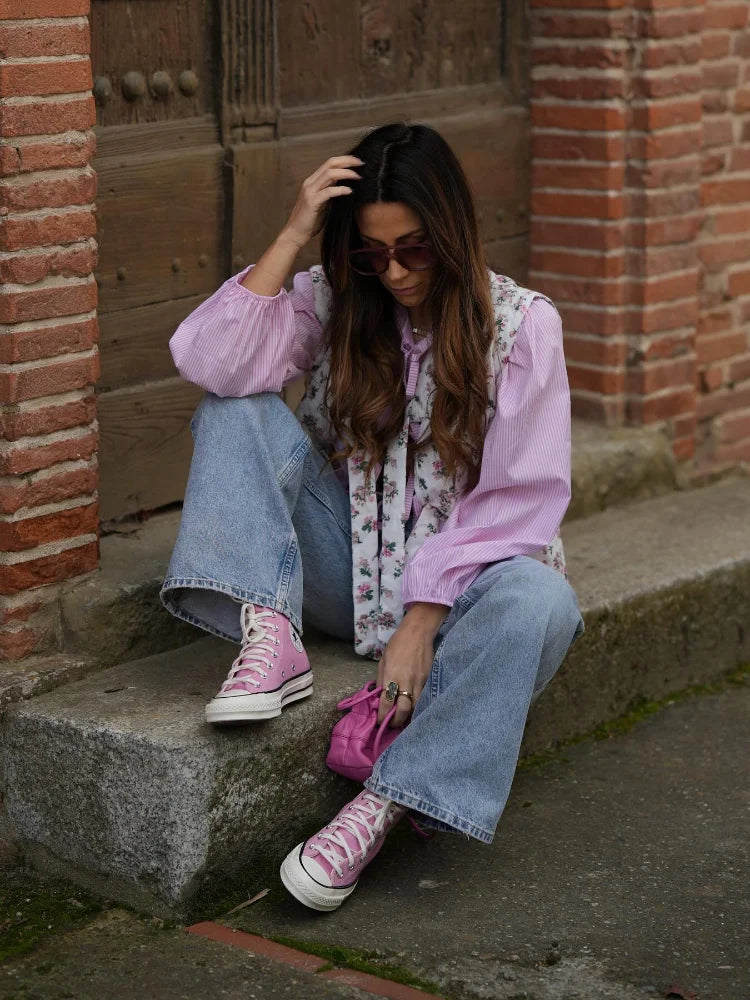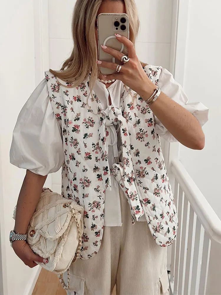 Women Spring Flower Print Lace Up Cotton Vest